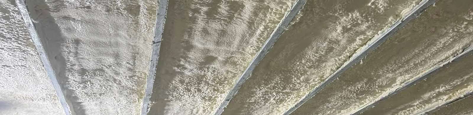 Open-cell spray foam insulation applied to attic roof with exposed rafters and ductwork.